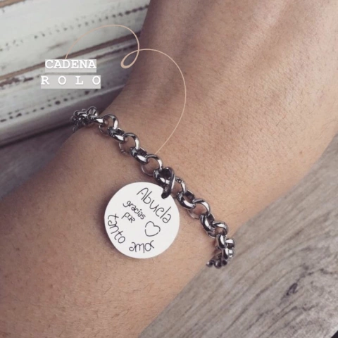 ¿Medidas de las cadenas? La Cadena rolo es regulable hasta 19 cm aproximadamente. Y la cadena tiffany es regulable hasta 21,5 cm aproximadamente. Podes agrandarla agregándole un pedacito de cadena o acortarla a tu medida para que te quede justita y no te sobre.Pulsera Abuela ~ Acero Quirúrgico O9